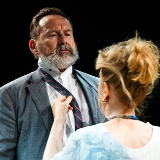 The long table, replacing the messy room, was taking the entire space, and, with the KXT arrangement, where the audience sits along opposite sides of the stage, the directing decision was brave. Everyone, the main couple and eight guests, was seated with their backs to the people watching, and that worked.
